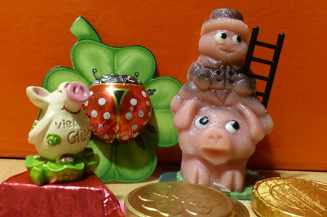 In Duitsland geloven ze dat een marsepeinen varkentje de geluksbrenger is. Je vindt deze varkentjes in alle winkels, warenhuizen en in de etalages van de bakker. Het zou je veel geluk geven in het nieuwe jaar.